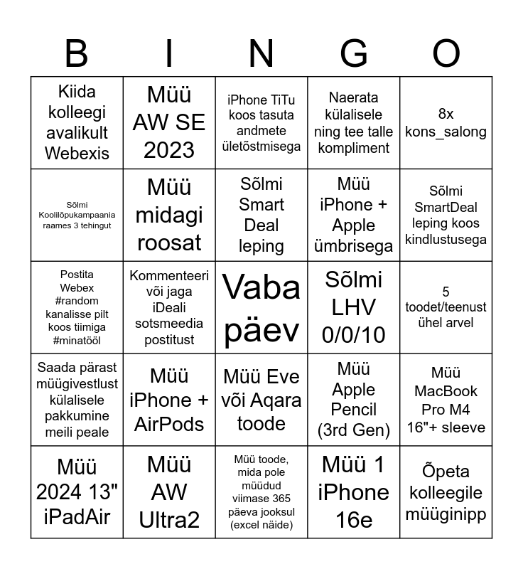 This bingo card has a free space and 24 words: Müü iPhone + AirPods, Müü AW Ultra2, Sõlmi Smart Deal leping, Müü 2024 13" iPadAir, 8x kons_salong, Kiida kolleegi avalikult Webexis, Sõlmi Koolilõpukampaania raames 3 tehingut, Müü AW SE 2023, Sõlmi LHV 0/0/10, Müü Eve või Aqara toode, Müü iPhone + Apple ümbrisega, Postita Webex #random kanalisse pilt koos tiimiga #minatööl, Müü Apple Pencil (3rd Gen), Müü MacBook Pro M4 16"+ sleeve, Müü midagi roosat, Müü 1 iPhone 16e, 5 toodet/teenust ühel arvel, iPhone TiTu koos tasuta andmete ületõstmisega, Sõlmi SmartDeal leping koos kindlustusega, Kommenteeri või jaga iDeali sotsmeedia postitust, Õpeta kolleegile müüginipp, Saada pärast müügivestlust külalisele pakkumine meili peale, Naerata külalisele ning tee talle kompliment and Müü toode, mida pole müüdud viimase 365 päeva jooksul (excel näide).