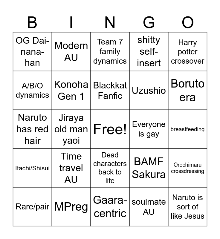 This bingo card has a free space and 24 words: Time travel AU, MPreg, Blackkat Fanfic, Rare/pair, Harry potter crossover, OG Dai-nana-han, A/B/O dynamics, Modern AU, Everyone is gay, Dead characters back to life, Uzushio, Naruto has red hair, BAMF Sakura, Orochimaru crossdressing, Konoha Gen 1, soulmate AU, breastfeeding, Team 7 family dynamics, Boruto era, Jiraya old man yaoi, Naruto is sort of like Jesus, Itachi/Shisui, shitty self-insert and Gaara-centric.