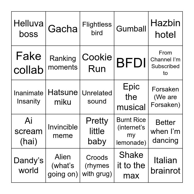 This bingo card has 25 words: Invincible meme, Croods (rhymes with grug), Cookie Run, Dandy’s world, Hazbin hotel, Helluva boss, Fake collab, Gacha, Epic the musical, Pretty little baby, BFDI, Inanimate Insanity, Burnt Rice (internet’s my lemonade), Better when I’m dancing, Ranking moments, Italian brainrot, Forsaken (We are Forsaken), Flightless bird, From Channel I’m Subscribed to, Hatsune miku, Unrelated sound, Alien (what’s going on), Ai scream (hai), Gumball and Shake it to the max.