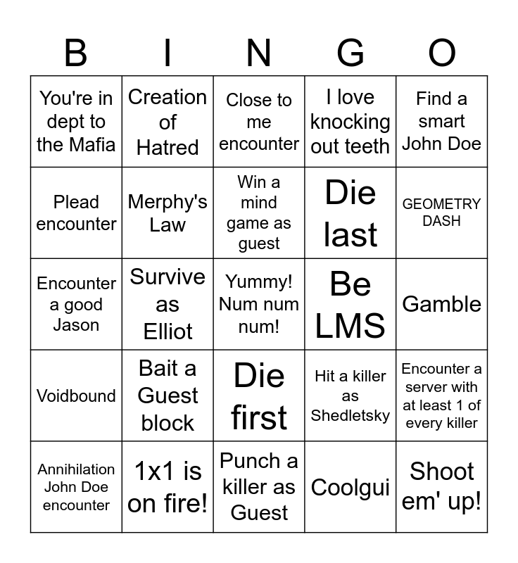 This bingo card has 25 words: Bait a Guest block, Punch a killer as Guest, Win a mind game as guest, Annihilation John Doe encounter, Find a smart John Doe, You're in dept to the Mafia, Plead encounter, Creation of Hatred, Be LMS, Die first, Die last, Encounter a good Jason, Hit a killer as Shedletsky, Encounter a server with at least 1 of every killer, Merphy's Law, Shoot em' up!, Gamble, Close to me encounter, GEOMETRY DASH, Survive as Elliot, Yummy! Num num num!, 1x1 is on fire!, Voidbound, I love knocking out teeth and Coolgui.
