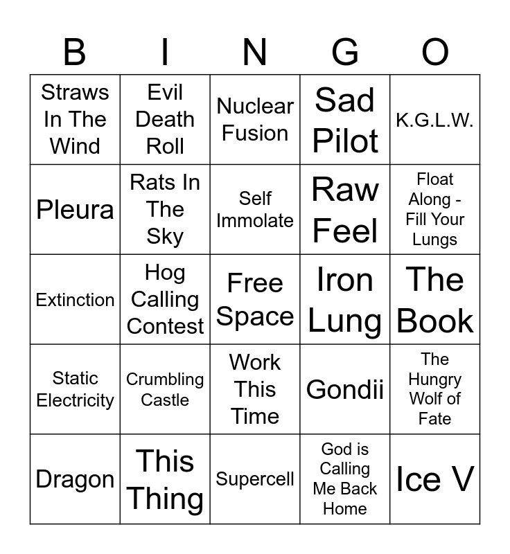 This bingo card has a free space and 24 words: Crumbling Castle, This Thing, Self Immolate, Dragon, K.G.L.W., Straws In The Wind, Pleura, Evil Death Roll, Iron Lung, Work This Time, Raw Feel, Extinction, Gondii, The Hungry Wolf of Fate, Rats In The Sky, God is Calling Me Back Home, The Book, Nuclear Fusion, Float Along - Fill Your Lungs, Hog Calling Contest, Ice V, Static Electricity, Sad Pilot and Supercell.