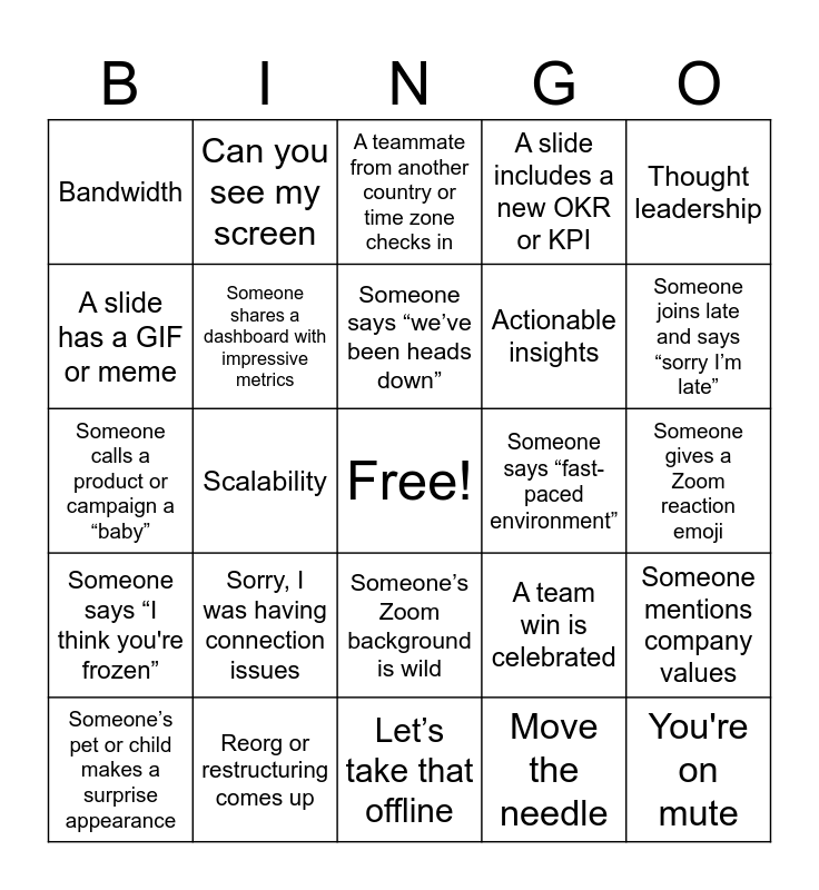 This bingo card has a free space and 49 words: Can you hear me, You're on mute, Next slide please, Let’s take that offline, Sorry, I was having connection issues, We’ll circle back on that, Can you see my screen, Someone shares a slide with way too much text, A slide has a GIF or meme, A slide transitions with a swoosh sound, Someone shares a dashboard with impressive metrics, A slide includes a new OKR or KPI, Someone mentions company values, A team win is celebrated, A Slack emoji reaction is mentioned or encouraged, Shout out to someone or a team, Someone says “we’ve been heads down”, Someone says “fast-paced environment”, Synergy, Thought leadership, Scalability, Move the needle, Bandwidth, Actionable insights, Growth mindset, Someone joins late and says “sorry I’m late”, Someone’s pet or child makes a surprise appearance, Background noise disrupts the call, Someone’s Zoom background is wild, Someone says “I think you're frozen”, Someone waves when leaving the meeting, Mention of Q3 planning or next quarter, Big things coming, Tease of a future project or initiative, Reorg or restructuring comes up, Someone says “this is just the beginning”, Drop it in the chat, Quick poll, Someone gives a Zoom reaction emoji, A question is asked and there’s a long silence, Someone says “feel free to reach out after”, Someone mentions a meme or inside joke, Someone’s wearing branded swag, Someone mispronounces a team member’s name, Someone calls a product or campaign a “baby”, A teammate from another country or time zone checks in, AI is changing rapidly, "Market Conditions" and Announces a change in strategy.