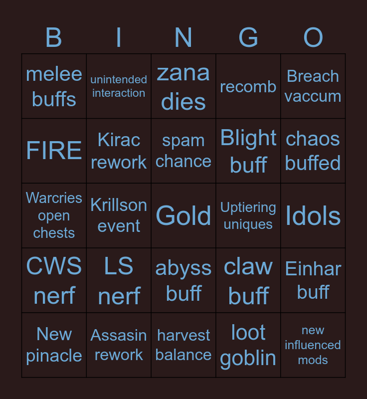 This bingo card has a free space and 24 words: LS nerf, Assasin rework, spam chance, New pinacle, Breach vaccum, melee buffs, FIRE, unintended interaction, Uptiering uniques, abyss buff, Blight buff, Warcries open chests, claw buff, Einhar buff, Kirac rework, loot goblin, Idols, zana dies, chaos buffed, Krillson event, new influenced mods, CWS nerf, recomb and harvest balance.