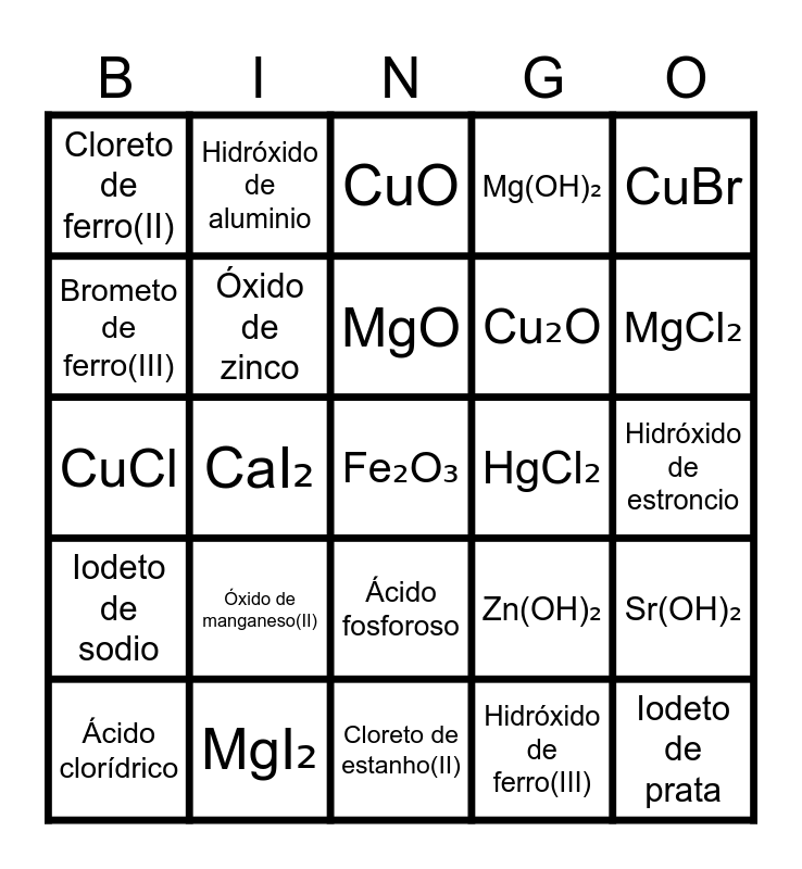This bingo card has 5 images and 105 words: ZnCl₂, AgOH, HgCl₂, FeBr₂, AlCl₃, KOH, CuCl₂, Ca(OH)₂, CuBr₂, KBr, SnCl₄, Sn(OH)₂, PbO₂, NaCl, HgO, MgH₂, CuCl, Pb(OH)₂, Co(OH)₃, KI, Sr(OH)₂, CrCl₂, LiCl, BaH₂, CaCl₂, MgO, CuBr, Co₂O₃, LiI, Mn(OH)₂, MgCl₂, Mg(OH)₂, CuO, Cr(OH)₂, Hg₂Cl₂, Fe₂O₃, Fe(OH)₂, Cr(OH)₃, MgI₂, Al₂O₃, CuOH, Na₂O, Cu₂O, CaI₂, Zn(OH)₂, Co(OH)₂, MnO₂, LiH, PbCl₂, Óxido de calcio, Hidróxido de bario, Óxido de litio, Hidróxido de ferro(III), Óxido de ferro(II), Cloreto de ferro(III), Hidróxido de aluminio, Óxido de cromo(VI), Hidroxido de calcio, Óxido de chumbo(II), Óxido de zinco, Cloreto de ferro(II), Cloreto de cobalto(II), Óxido de cromo(II), Brometo de prata, Hidróxido de mercurio(II), Óxido de manganeso(II), Cloreto de níquel(II), Hidroxído de potasio, Cloreto de prata, Hidróxido de ferro(II), Iodeto de zinco, Óxido de bario, Hidróxido de aluminio, Óxido de estanho(IV), Hidróxido de ferro(III), Cloreto de manganeso(II), Iodeto de chumbo(II), Hidróxido de estroncio, Hidróxido de níquel(II), Óxido de plata, Hidróxido de cobre(II), Óxido de estroncio, Hidróxido de estanho(IV), Cloreto de potassio, Brometo de calcio, Iodeto de prata, Hidróxido de sodio, Hidróxido de litio, Hidróxido de manganeso(IV), Óxido de níquel(II), Cloreto de estroncio, Brometo de ferro(III), Brometo de sodio, Iodeto de sodio, Óxido de cromo(III), Hidróxido de sodio, Cloreto de bario, Óxido de estanho(II), Óxido de potassio, Cloreto de estanho(II), Óxido de cobalto(II), Ácido sulfúrico, Ácido nítrico, Ácido clorídrico and Ácido fosforoso.