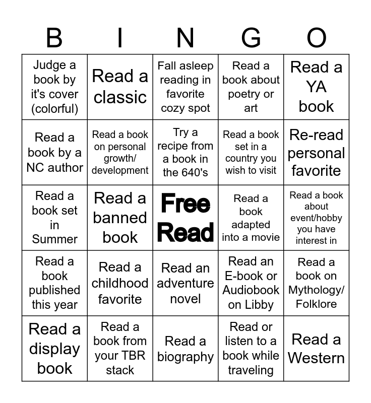 This bingo card has a free space and 24 words: Read a childhood favorite, Read a book from your TBR stack, Try a recipe from a book in the 640's, Read a display book, Read a YA book, Judge a book by it's cover (colorful), Read a book by a NC author, Read a classic, Read a book adapted into a movie, Read an adventure novel, Read a book set in a country you wish to visit, Read a book set in Summer, Read an E-book or Audiobook on Libby, Read a book on Mythology/ Folklore, Read a book on personal growth/ development, Read or listen to a book while traveling, Read a book about event/hobby you have interest in, Fall asleep reading in favorite cozy spot, Re-read personal favorite, Read a banned book, Read a Western, Read a book published this year, Read a book about poetry or art and Read a biography.