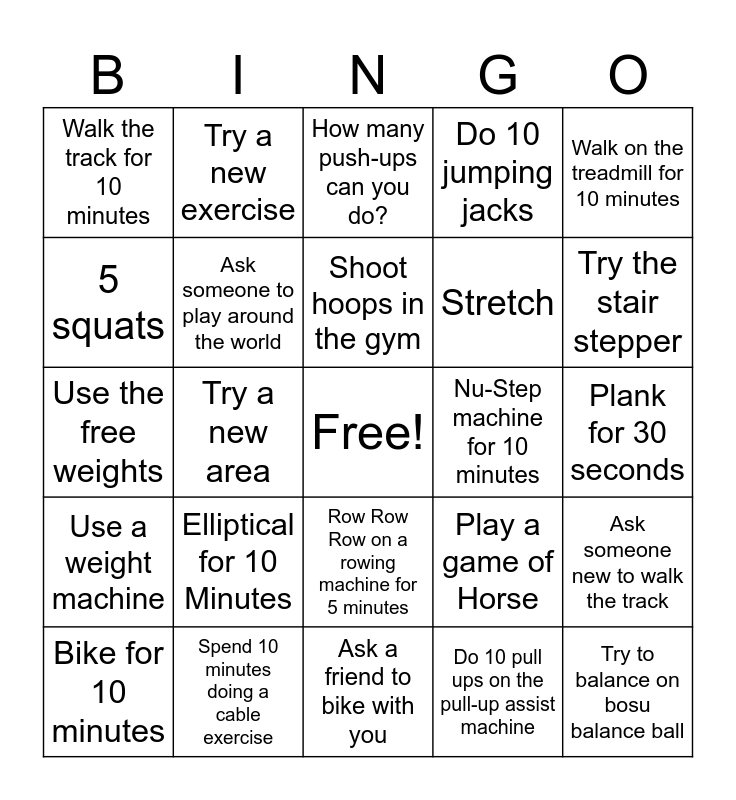 This bingo card has a free space and 24 words: Elliptical for 10 Minutes, Spend 10 minutes doing a cable exercise, Shoot hoops in the gym, Bike for 10 minutes, Walk on the treadmill for 10 minutes, Walk the track for 10 minutes, 5 squats, Try a new exercise, Nu-Step machine for 10 minutes, Row Row Row on a rowing machine for 5 minutes, Stretch, Use the free weights, Play a game of Horse, Ask someone new to walk the track, Ask someone to play around the world, Do 10 pull ups on the pull-up assist machine, Plank for 30 seconds, How many push-ups can you do?, Try the stair stepper, Try a new area, Try to balance on bosu balance ball, Use a weight machine, Do 10 jumping jacks and Ask a friend to bike with you.