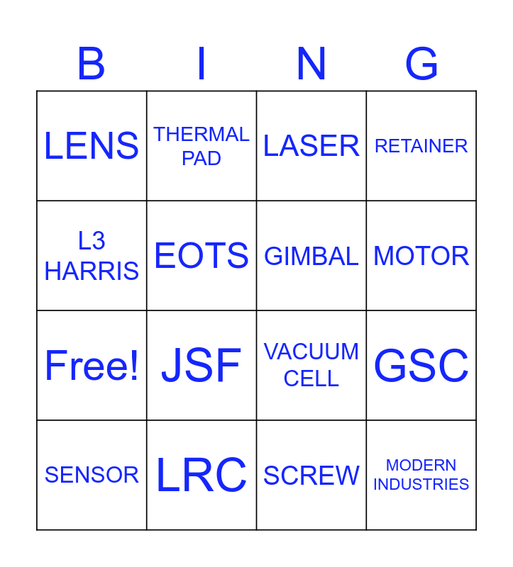 This bingo card has 20 words: SENSOR, F-35, LASER, GSC, ELEVATION MIRROR, JSF, SCREW, RETAINER, Free!, THERMAL PAD, VACUUM CELL, MOTOR, LENS, LRC, GIMBAL, AZ HOUSING, L3 HARRIS, EOTS, SLIP RING and MODERN INDUSTRIES.