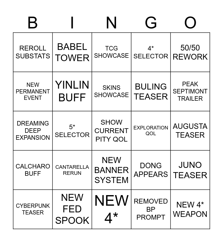 This bingo card has 25 words: CANTARELLA RERUN, NEW 4*, SKINS SHOWCASE, CYBERPUNK TEASER, 50/50 REWORK, REROLL SUBSTATS, NEW PERMANENT EVENT, BABEL TOWER, EXPLORATION QOL, NEW BANNER SYSTEM, BULING TEASER, DREAMING DEEP EXPANSION, DONG APPEARS, JUNO TEASER, YINLIN BUFF, NEW 4* WEAPON, AUGUSTA TEASER, TCG SHOWCASE, PEAK SEPTIMONT TRAILER, 5* SELECTOR, SHOW CURRENT PITY QOL, NEW FED SPOOK, CALCHARO BUFF, 4* SELECTOR and REMOVED BP PROMPT.