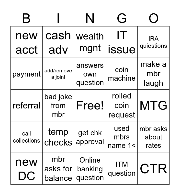 This bingo card has a free space and 24 words: temp checks, mbr asks for balance, answers own question, new DC, IRA quiestions, new acct, payment, cash adv, rolled coin request, get chk approval, coin machine, referral, used mbrs name 1<, mbr asks about rates, add/remove a joint, ITM question, MTG, wealth mgnt, make a mbr laugh, bad joke from mbr, CTR, call collections, IT issue and Online banking question.