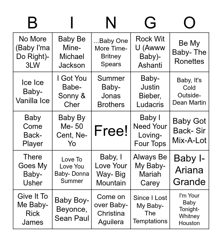 This bingo card has a free space and 27 words: Always Be My Baby- Mariah Carey, Baby Love- The Supremes, Baby- Justin Bieber, Ludacris, Come on over Baby- Christina Aguilera, Ice Ice Baby- Vanilla Ice, ...Baby One More Time- Britney Spears, Baby Be Mine- Michael Jackson, There Goes My Baby-Usher, Baby I Need Your Loving-Four Tops, Baby I- Ariana Grande, Baby Come Back- Player, Rock Wit U (Awww Baby)- Ashanti, Give It To Me Baby- Rick James, Baby Boy- Beyonce, Sean Paul, Baby, It's Cold Outside- Dean Martin, Baby Shark- Pinkfong, I Got You Babe- Sonny & Cher, Summer Baby- Jonas Brothers, Love To Love You Baby- Donna Summer, No More (Baby I'ma Do Right)- 3LW, Baby Got Back- Sir Mix-A-Lot, Since I Lost My Baby- The Temptations, Baby By Me- 50 Cent, Ne-Yo, I'm Your Baby Tonight- Whitney Houston, Baby, I Love Your Way- Big Mountain, Be My Baby- The Ronettes and Hey Baby- Pitbull, T- Pain.