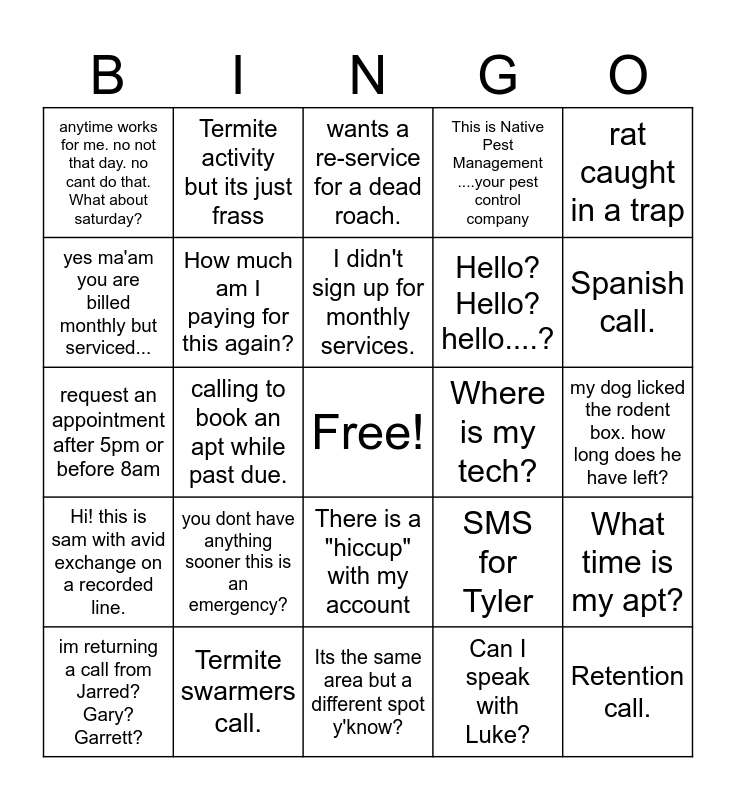 This bingo card has a free space and 27 words: SMS for Tyler, IM SEEING CAWCAWRAWCHES!!, Hello? Hello? hello....?, Its the same area but a different spot y'know?, yes ma'am you are billed monthly but serviced..., wants a re-service for a dead roach., Termite activity but its just frass, Hi! this is sam with avid exchange on a recorded line., Where is my tech?, What time is my apt?, request an appointment after 5pm or before 8am, This is Native Pest Management ....your pest control company, im returning a call from Jarred? Gary? Garrett?, Termite swarmers call., Spanish call., I need to cancel my account. Im no longer seeing bugs, How much am I paying for this again?, I didn't sign up for monthly services., you dont have anything sooner this is an emergency?, anytime works for me. no not that day. no cant do that. What about saturday?, my dog licked the rodent box. how long does he have left?, Can I speak with Luke?, calling to book an apt while past due., Retention call., There is a "hiccup" with my account, rat caught in a trap and I have "Russian" "Greek" etc roaches.