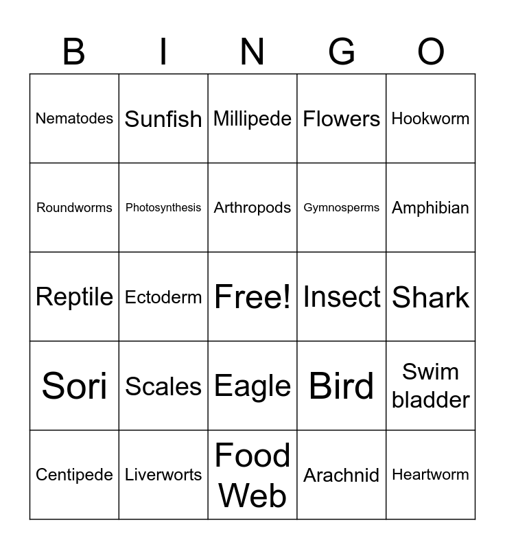 This bingo card has a free space and 62 words: Moss, Liverworts, Ferns, Sori, Non-vascular plants, Vascular plants, Photosynthesis, Seed plants, Gymnosperms, Angiosperms, Flowers, Cones, Roundworms, Flatworms, Animals, Nematodes, Heartworm, Hookworm, Malaria, Arthropods, Insect, Millipede, Centipede, Arachnid, Octopus, Mollusc, Cnidarians, Fish, Swim bladder, Lateral line, Cartilaginous fish, Bony fish, Jawless fish, Lamprey, Shark, Sunfish, Warm-blooded, Cold-blooded, Ectoderm, Endoderm, Reptile, Claws, Scales, Water, Amphibian, Bird, Feathers, Fur, Milk, Loon, Eagle, Food Web, Food chain, Herbivore, Carnivore, Omnivore, Decomposers, Consumer, Producer/Plants, 10% Rule, Trophic Level and Tetrapod.