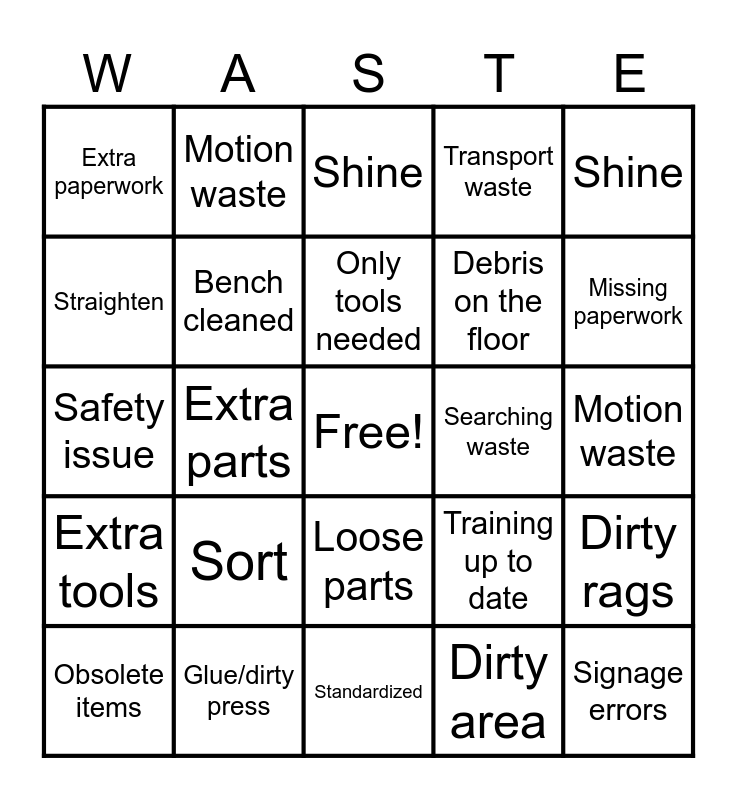 This bingo card has a free space and 24 words: Sort, Glue/dirty press, Only tools needed, Obsolete items, Shine, Extra paperwork, Straighten, Motion waste, Searching waste, Loose parts, Debris on the floor, Safety issue, Training up to date, Dirty rags, Bench cleaned, Dirty area, Motion waste, Shine, Missing paperwork, Extra parts, Signage errors, Extra tools, Transport waste and Standardized.
