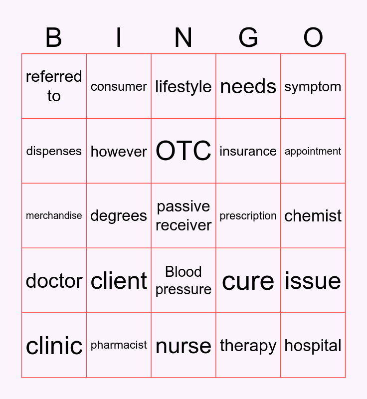 This bingo card has 51 words: pharmacy, passive receiver, communication, nurse, client, vaccine, consumer, compliance, dispenses, collaborate, however, needs, issue, cure, immunization, rehabilitation, OTC, prescription, 田, symptom, degrees, therapy, referred to, insurance, health promotion, hospital, appointment, wellness, clinic, lifestyle, adaptation, filled, diagnosis, consultation, professional, pharmacist, drugstore, infection, prevention, treatment, chemist, doctor, healthcare, order, dose, medication, merchandise, disease, checkup, Blood pressure and Vital signs.