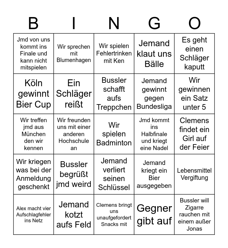This bingo card has a free space and 24 words: Bussler begrüßt jmd weird, Jemand kotzt aufs Feld, Bussler schafft aufs Treppchen, Alex macht vier Aufschlagfehler ins Netz, Es geht einen Schläger kaputt, Jmd von uns kommt ins Finale und kann nicht mitspielen, Köln gewinnt Bier Cup, Wir sprechen mit Blumenhagen, Jmd kommt ins Halbfinale und kriegt eine Nadel, Jemand verliert seinen Schlüssel, Jemand gewinnt gegen Bundesliga, Wir treffen jmd aus München den wir kennen, Jemand kriegt ein Bier ausgegeben, Lebensmittel Vergiftung, Ein Schläger reißt, Gegner gibt auf, Clemens findet ein Girl auf der Feier, Wir spielen Fehlertrinken mit Ken, Wir gewinnen ein Satz unter 5, Wir freunden uns mit einer anderen Hochschule an, Bussler will Zigarre rauchen mit einem außer Jonas, Wir kriegen was bei der Anmeldung geschenkt, Jemand klaut uns Bälle and Clemens bringt uns unaufgefordert Snacks mit.