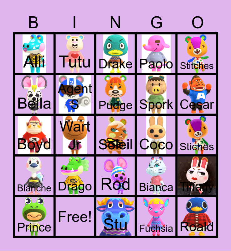 This bingo card has 26 images and 28 words: Tiffany, Bertha, Spork, Fuchsia, Bella, Drake, Tutu, Blanche, Coco, Prince, Boyd, Paolo, Free!, Stu, Cesar, Sterling, Drago, Agent S, Pudge, Rod, Alli, Roald, Soleil, Wart Jr, Stiches, Bianca, Stitches and Free!.