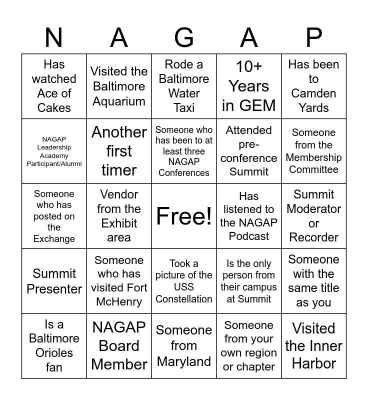 This bingo card has a free space and 27 words: Is the only person from their campus at Summit, Is a member of a NAGAP community, Attended pre-conference Summit, Someone from Maryland, NAGAP Leadership Academy Participant/Alumni, Rode a Baltimore Water Taxi, Visited the Baltimore Aquarium, Summit Presenter, Has listened to the NAGAP Podcast, Someone with the same title as you, Someone who has posted on the Exchange, 10+ Years in GEM, Is a Baltimore Orioles fan, NAGAP Board Member, Someone from the Membership Committee, Has eaten a crabcake in Baltimore, Another first timer, Someone who has been to at least three NAGAP Conferences, Someone who has visited Fort McHenry, Has watched Ace of Cakes, Summit Moderator or Recorder, Someone from your own region or chapter, Vendor from the Exhibit area, Visited the Inner Harbor, Took a picture of the USS Constellation, Has been to Camden Yards and Has seen the Domino Sugar sign.