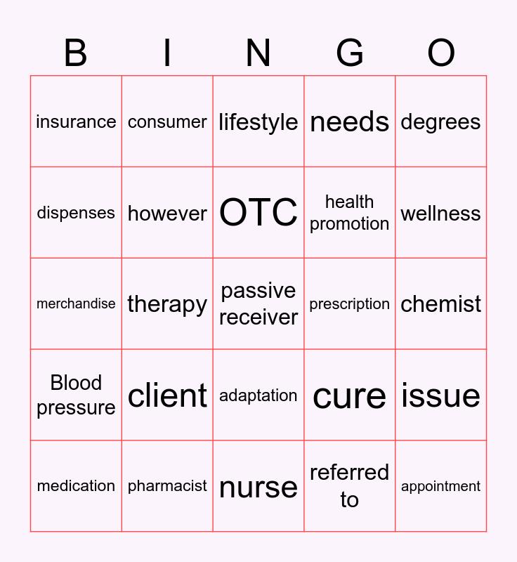 This bingo card has 50 words: pharmacy, passive receiver, communication, nurse, client, vaccine, consumer, compliance, dispenses, collaborate, however, needs, issue, cure, immunization, rehabilitation, OTC, prescription, symptom, degrees, therapy, referred to, insurance, health promotion, hospital, appointment, wellness, clinic, lifestyle, adaptation, filled, diagnosis, consultation, professional, pharmacist, drugstore, infection, prevention, treatment, chemist, doctor, healthcare, order, dose, medication, merchandise, disease, checkup, Blood pressure and Vital signs.
