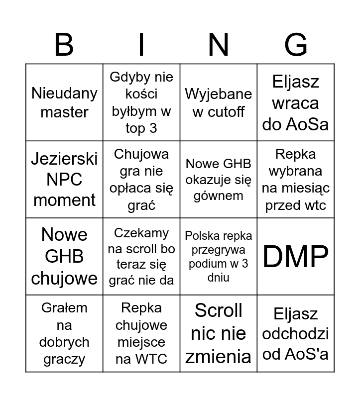 This bingo card has 23 words: Eljasz odchodzi od AoS'a, Gordon kupuje nową OP armie, Repka wybrana na miesiąc przed wtc, Kułak dostaje karniaki za chlanie, Jezierski NPC moment, Nieudany master, Chujowa gra nie opłaca się grać, Gdyby nie kości byłbym w top 3, Grałem na dobrych graczy, Poznań w Repce, Czekamy na scroll bo teraz się grać nie da, Nowe GHB chujowe, Chujowy scroll, Nowe GHB hype, Repka chujowe miejsce na WTC, Eljasz wraca do AoSa, Wyjebane w cutoff, Polska repka przegrywa podium w 3 dniu, Nowe GHB okazuje się gównem, DMP, Eljasz wraca do AoSa, Scroll nic nie zmienia and Chujowy scroll.