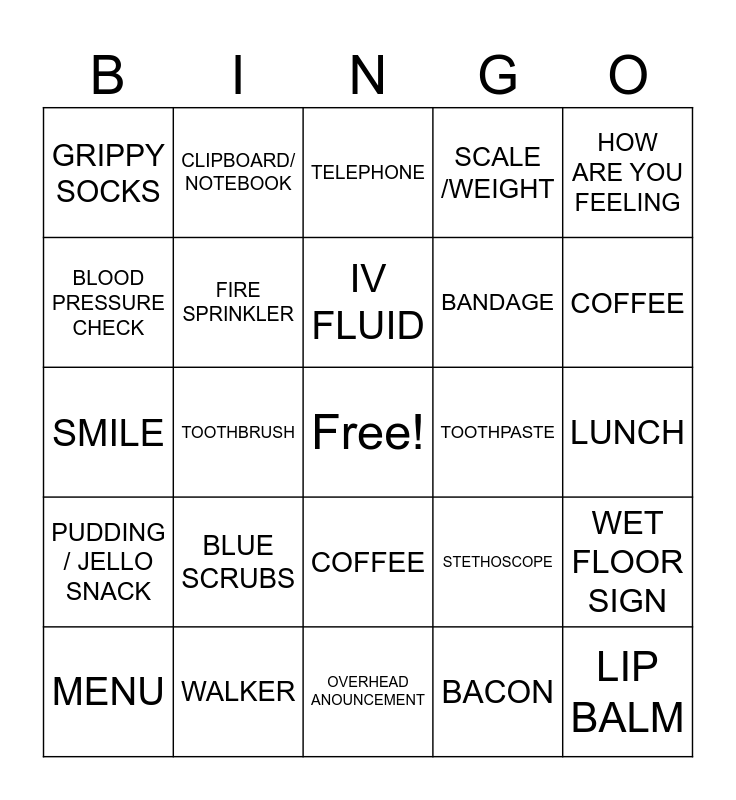 This bingo card has a free space and 65 words: VISIT FROM PROVIDER, RESPIRATORY VISIT, WALKER, WET FLOOR SIGN, DARK HAIRED NURSE, INFORMATION PAPERWORK, CLIPBOARD/ NOTEBOOK, NAME BADGE, IV FLUID, TISSUE, COFFEE, HI, LUNCH, HOW ARE YOU FEELING, GREEN VEGETABLE, BLOOD PRESSURE CHECK, TOOTHBRUSH, GRIPPY SOCKS, MASK, BANDAGE, BLUE SCRUBS, PUDDING / JELLO SNACK, SCALE /WEIGHT, DRINK CUP, WAVE, WHEELCHAIR, PT VISIT, SHOWER, LIP BALM, FOOD TRAY, MENU, ROOM SERVICE VISIT, LAB WORK, MEDICATION DELIVERED, STETHOSCOPE, WALKER, HAND LOTION, SMILE, BACON, BLONDE NURSE, FIRE SPRINKLER, FLOWERED SCRUBS, TOOTHPASTE, WHITE BOARD, GOWN, BED PAN, COFFEE, FIRE SPRINKLER, CALL BUTTON, WARM BLANKET, HOUSEKEEPER, DIETARY STAFF, THERMOMETER, OVERHEAD ANOUNCEMENT, TEA, JUICE, TV, TELEPHONE, SANDWICH, FAN, INFORMATION BOOKLET, CLOCK, HAND SANITIZER, MOP and WET WIPES.