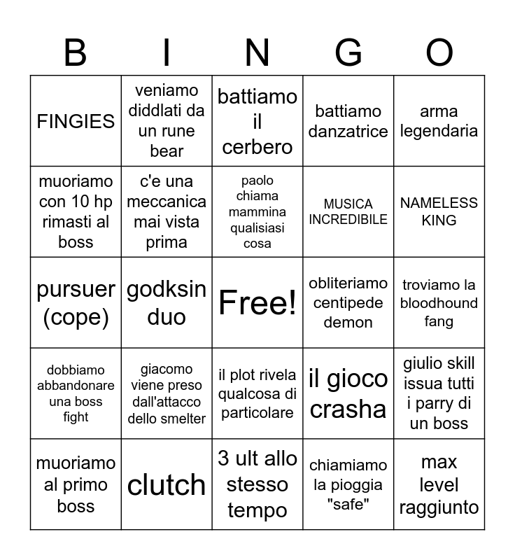 This bingo card has a free space and 24 words: muoriamo al primo boss, giacomo viene preso dall'attacco dello smelter, paolo chiama mammina qualisiasi cosa, chiamiamo la pioggia "safe", arma legendaria, FINGIES, veniamo diddlati da un rune bear, battiamo il cerbero, obliteriamo centipede demon, troviamo la bloodhound fang, pursuer (cope), c'e una meccanica mai vista prima, il gioco crasha, giulio skill issua tutti i parry di un boss, muoriamo con 10 hp rimasti al boss, clutch, 3 ult allo stesso tempo, battiamo danzatrice, NAMELESS KING, dobbiamo abbandonare una boss fight, godksin duo, il plot rivela qualcosa di particolare, MUSICA INCREDIBILE and max level raggiunto.