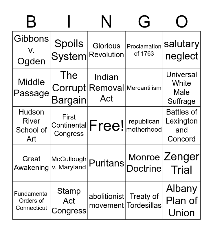 This bingo card has a free space and 24 words: McCullough v. Maryland, Stamp Act Congress, Indian Removal Act, Fundamental Orders of Connecticut, salutary neglect, Gibbons v. Ogden, Middle Passage, Spoils System, republican motherhood, Puritans, Mercantilism, Hudson River School of Art, Monroe Doctrine, Zenger Trial, The Corrupt Bargain, Treaty of Tordesillas, Battles of Lexington and Concord, Glorious Revolution, Universal White Male Suffrage, First Continental Congress, Albany Plan of Union, Great Awakening, Proclamation of 1763 and abolitionist movement.