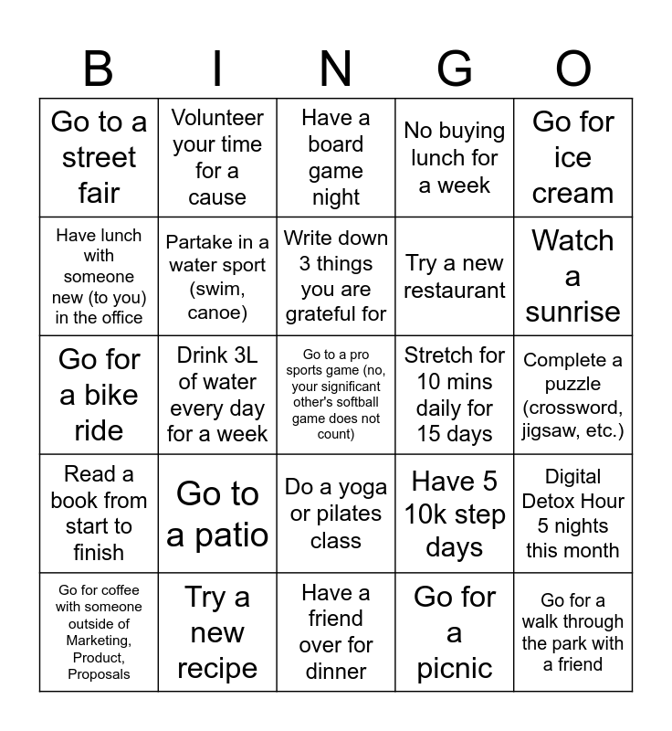 This bingo card has 29 words: Go for coffee with someone outside of Marketing, Product, Proposals, Go to a farmer’s market, Go to a pro sports game (no, your significant other's softball game does not count), Go for a picnic, Go for ice cream, Have lunch with someone new (to you) in the office, Volunteer your time for a cause, Have a friend over for dinner, Stretch for 10 mins daily for 15 days, Go for a walk through the park with a friend, Go for a bike ride, Partake in a water sport (swim, canoe), Try a new fruit or vegetable, Have 5 10k step days, Complete a puzzle (crossword, jigsaw, etc.), Try a new craft/hobby (painting, knitting, pickleball), Drink 3L of water every day for a week, Do a yoga or pilates class, No buying lunch for a week, Digital Detox Hour 5 nights this month, Read a book from start to finish, Try a new recipe, Write down 3 things you are grateful for, Try a new restaurant, Watch a sunrise, Go to a street fair, Go to a patio, Have a board game night and Journal at least once per week.