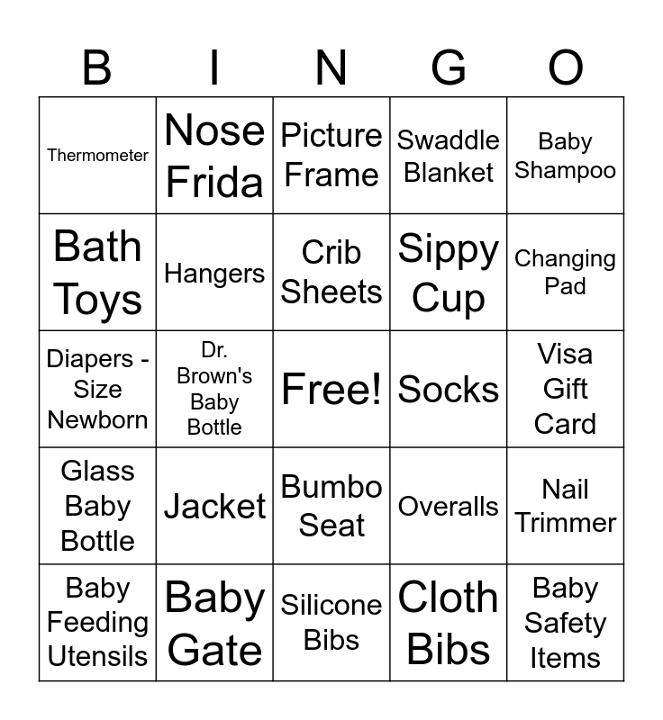 This bingo card has a free space and 61 words: Teddy Bear, Baby Gate, Burp Cloths, Glass Baby Bottle, Cloth Bibs, Sleep Sack, Hangers, Bottle Drying Rack, Sippy Cup, Baby Wash Cloths, Swaddle Blanket, Winter Hat, Bath Toys, Teething Toy, Pacifier, Thermometer, Baby Safety Items, Baby Shampoo, Baby Monitor, Crib Sheets, Socks, Picture Frame, Baby Feeding Utensils, Nail Trimmer, Blocks, Food Storage Containers, Nursery Decor, Burp Cloths, Changing Pad, Baby Lotion, Diaper Bag, Baby Medicine, Monogrammed Blanket, Stuffed Animal - Dog, Nose Frida, A Onesie with Golf Clubs, A Onesie with Cars, Dr. Brown's Baby Bottle, Advent Baby Bottle, Diapers - Size Newborn, Baseball Hat, Jacket, Visa Gift Card, Pacifier Clip/Holder, Overalls, Target Gift Card, Stuffed Animal - Duck, A Onesie with Puppies, Magnetic Onesies, Bumbo Seat, Silicone Bibs, Blue Onesie, Diapers - Size 2, Baby Carrier, Pampers Baby Wipes, Alphabet Book, Blue Baby Blanket, Music Toys, Book About Animals, Baltimore Ravens Onesie and Amazon Gift Card.
