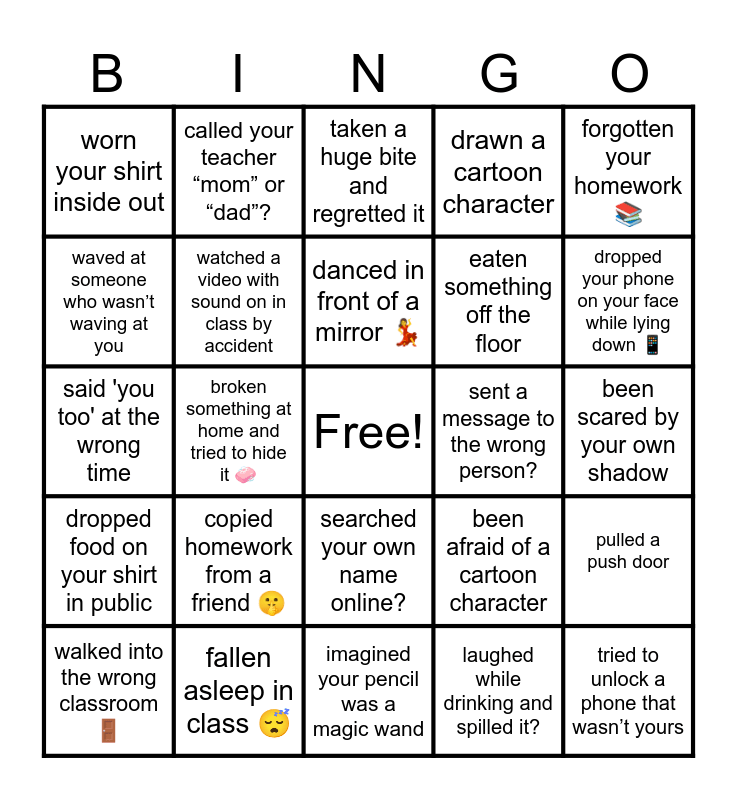This bingo card has a free space and 24 words: copied homework from a friend 🤫, fallen asleep in class 😴, danced in front of a mirror 💃, walked into the wrong classroom 🚪, forgotten your homework 📚, worn your shirt inside out, waved at someone who wasn’t waving at you, called your teacher “mom” or “dad”?, sent a message to the wrong person?, searched your own name online?, eaten something off the floor, said 'you too' at the wrong time, been afraid of a cartoon character, pulled a push door, watched a video with sound on in class by accident, laughed while drinking and spilled it?, been scared by your own shadow, taken a huge bite and regretted it, dropped your phone on your face while lying down 📱, broken something at home and tried to hide it 🧼, tried to unlock a phone that wasn’t yours, dropped food on your shirt in public, drawn a cartoon character and imagined your pencil was a magic wand.