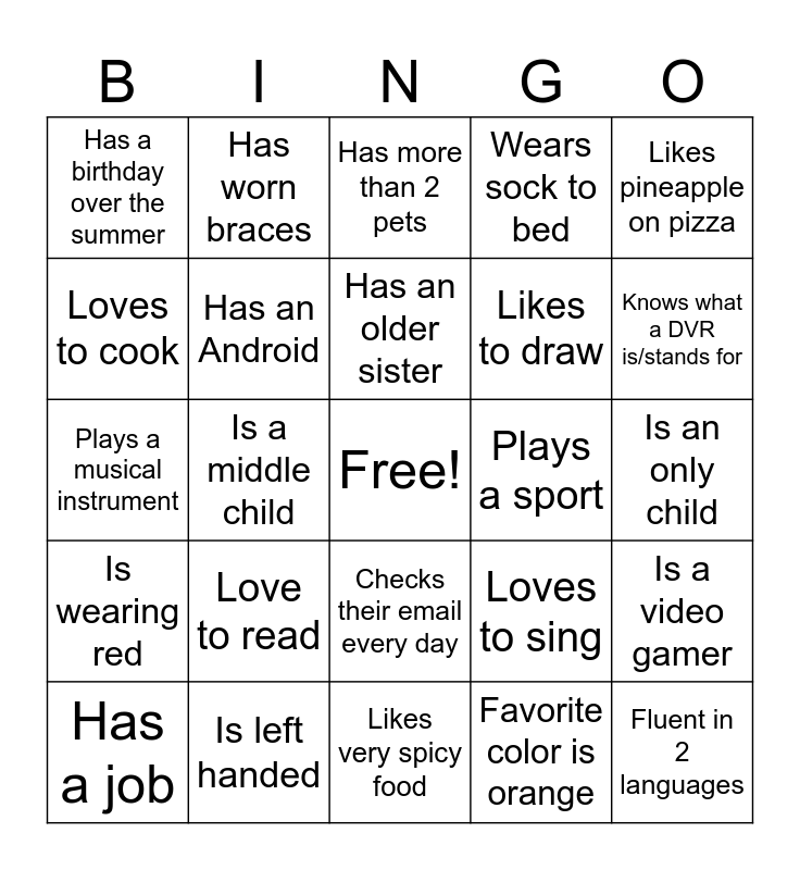 This bingo card has a free space and 24 words: Has a job, Love to read, Has an older sister, Favorite color is orange, Likes pineapple on pizza, Has a birthday over the summer, Has worn braces, Has more than 2 pets, Plays a sport, Is an only child, Plays a musical instrument, Has an Android, Loves to sing, Is a video gamer, Loves to cook, Is left handed, Likes very spicy food, Wears sock to bed, Knows what a DVR is/stands for, Is wearing red, Is a middle child, Checks their email every day, Likes to draw and Fluent in 2 languages.