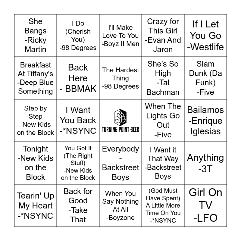 This bingo card has a free space and 33 words: Summer Girls -LFO, End of the Road -Boyz II Men, I Want You Back -*NSYNC, As Long As You Love Me -Backstreet Boys, Tonight -New Kids on the Block, Back Here - BBMAK, If I Let You Go -Westlife, Tearin' Up My Heart -*NSYNC, I Do (Cherish You) -98 Degrees, MMMBop -Hanson, The Hardest Thing -98 Degrees, I'll Make Love To You -Boyz II Men, I Swear -All-4-One, I Can Love You Like That -All-4-One, When The Lights Go Out -Five, Slam Dunk (Da Funk) -Five, Back for Good -Take That, Step by Step -New Kids on the Block, You Got It (The Right Stuff) -New Kids on the Block, I Want it That Way -Backstreet Boys, Everybody -Backstreet Boys, Livin' La Vida Loca -Ricky Martin, She Bangs -Ricky Martin, Bailamos -Enrique Iglesias, When You Say Nothing At All -Boyzone, Girl On TV -LFO, Crazy for This Girl -Evan And Jaron, She's So High -Tal Bachman, Breakfast At Tiffany's -Deep Blue Something, Anything -3T, Invisible Man -98 Degrees, (God Must Have Spent) A Little More Time On You -*NSYNC and Quit Playing Games (With My Heart) -Backstreet Boys.