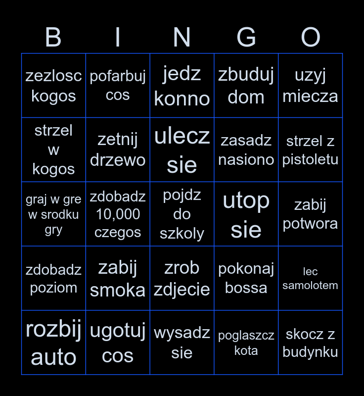 This bingo card has 60 words: zdobadz jajko, ugotuj cos, zabij zombie, zdobadz poziom, poglaszcz kota, przebierz sie, zetnij drzewo, zrob dziecko, zasadz nasiono, porozmawiaj z NPC, zbuduj dom, poglaszcz psa, strzel w kogos, strzel w siebie, wykop dziure, zezlosc kogos, pojdz do szkoly, uzyj miecza, zabij kogos lub zniszcz cos bomba, ulecz sie, utop sie, jedz konno, rozbij auto, lec samolotem, zdobadz combo wieksze niz 5, ukoncz quiz, turlaj sie lub zjedz z gory, wykop jakis mineral, strzel z pistoletu, wypij cos, zjedz mieso, daj komus prezent, pojdz do pracy, umyj sie albo ubranie, pofarbuj cos, narysuj cos, wyslij cos poczta, zdobadz 10,000 czegos, wydaj 10,000 pieniedzy, graj w gre w srodku gry, siuraj, zabij smoka, zabij potwora, spotkaj ducha, pokonaj bossa, przeskocz nad przepascia, znajdz zolwia, znajdz zabe, ujezdzaj cos innego niz konia, zrob zdjecie, wysadz sie, zatancz, pokonaj zombie, pokonaj szkieleta, zrob trickshota, namaluj cos, zagraj muzyke, napisz cos, skocz z budynku and zbierz stworka.