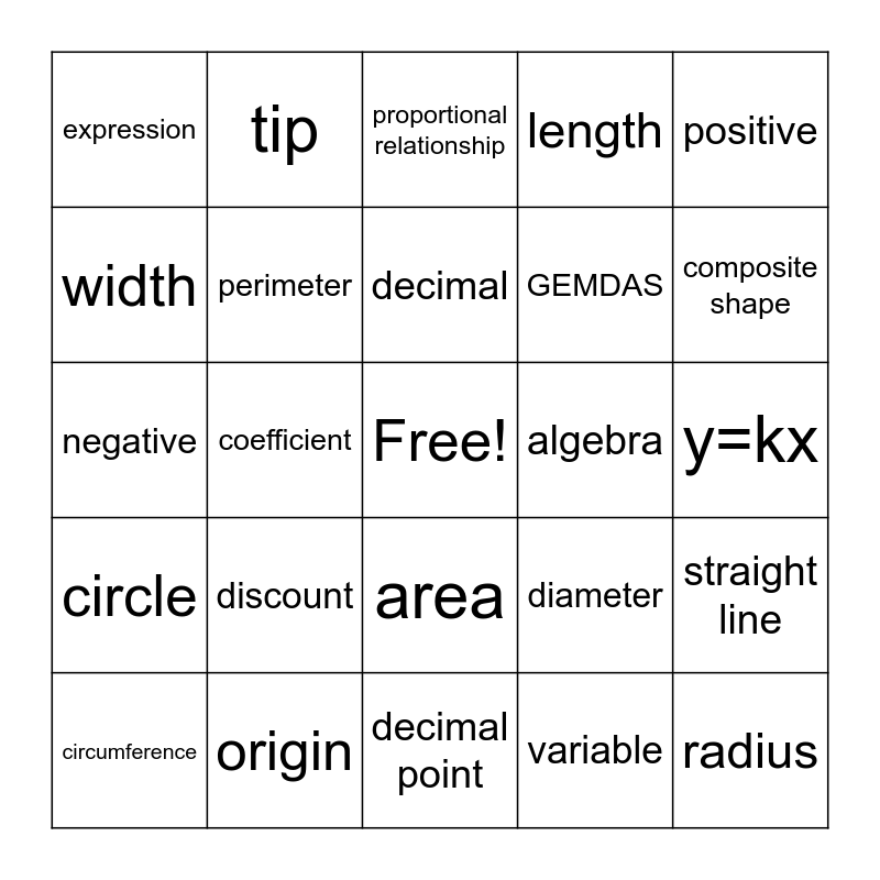 This bingo card has a free space and 35 words: scale factor, scale copy, constant of proportionality, perimeter, area, length, width, percent, decimal, fraction, negative, positive, like terms, equation, expression, algebra, variable, coefficient, circle, radius, diameter, circumference, straight line, origin, proportional relationship, composite shape, triangle, zero pair, GEMDAS, y=kx, pi x radius x radius, decimal point, discount, tip and tax.