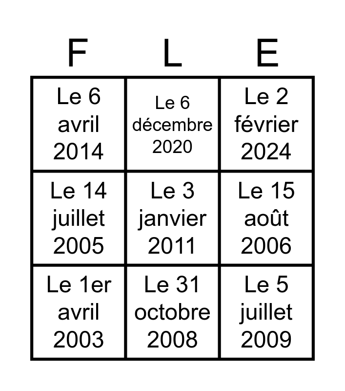 This bingo card has 35 words: Le 1er janvier 2000, Le 14 février 2001, Le 21 mars 2002, Le 1er avril 2003, Le 9 mai 2004, Le 14 juillet 2005, Le 15 août 2006, Le 1er septembre 2007, Le 31 octobre 2008, Le 11 novembre 2009, Le 25 décembre 2010, Le 3 janvier 2011, Le 7 février 2012, Le 12 mars 2013, Le 6 avril 2014, Le 18 mai 2015, Le 22 juin 2016, Le 9 juillet 2017, Le 16 août 2018, Le 28 septembre 2019, Le 4 octobre 2020, Le 13 novembre 2021, Le 24 décembre 2022, Le 10 janvier 2023, Le 2 février 2024, Le 17 mars 2025, Le 1er mai 2023, Le 20 juin 2006, Le 5 juillet 2009, Le 30 août 2012, Le 19 septembre 2014, Le 8 octobre 2016, Le 27 novembre 2018, Le 6 décembre 2020 and Le 15 avril 2022.