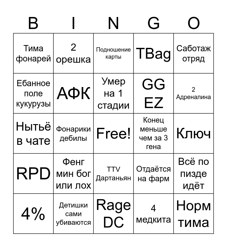 This bingo card has a free space and 24 words: Фенг мин бог или лох, Детишки сами убиваются, Умер на 1 стадии, 4%, Саботаж отряд, Тима фонарей, Ебанное поле кукурузы, 2 орешка, Конец меньше чем за 3 гена, TTV Дартаньян, GG EZ, Нытьё в чате, Отдаётся на фарм, Всё по пизде идёт, АФК, 4 медкита, Ключ, Подношение карты, 2 Адреналина, Фонарики дебилы, Норм тима, RPD, TBag and Rage DC.