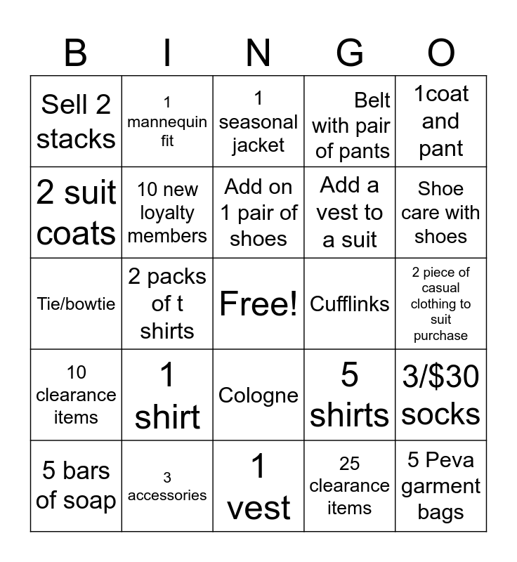 This bingo card has a free space and 24 words: 1 shirt, 3 accessories, Add on 1 pair of shoes, 5 bars of soap, 1coat and pant, Sell 2 stacks, 2 suit coats, 1 mannequin fit, Cufflinks, Cologne, Add a vest to a suit, Tie/bowtie, 5 shirts, 3/$30 socks, 10 new loyalty members, 25 clearance items, 2 piece of casual clothing to suit purchase, 1 seasonal jacket, Shoe care with shoes, 2 packs of t shirts, 5 Peva garment bags, 10 clearance items, Belt with pair of pants and 1 vest.