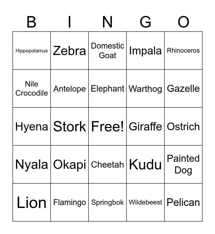 This bingo card has a free space and 24 words: Okapi, Flamingo, Elephant, Lion, Rhinoceros, Hippopotamus, Nile Crocodile, Zebra, Giraffe, Cheetah, Warthog, Hyena, Kudu, Painted Dog, Antelope, Wildebeest, Ostrich, Domestic Goat, Gazelle, Stork, Pelican, Nyala, Impala and Springbok.