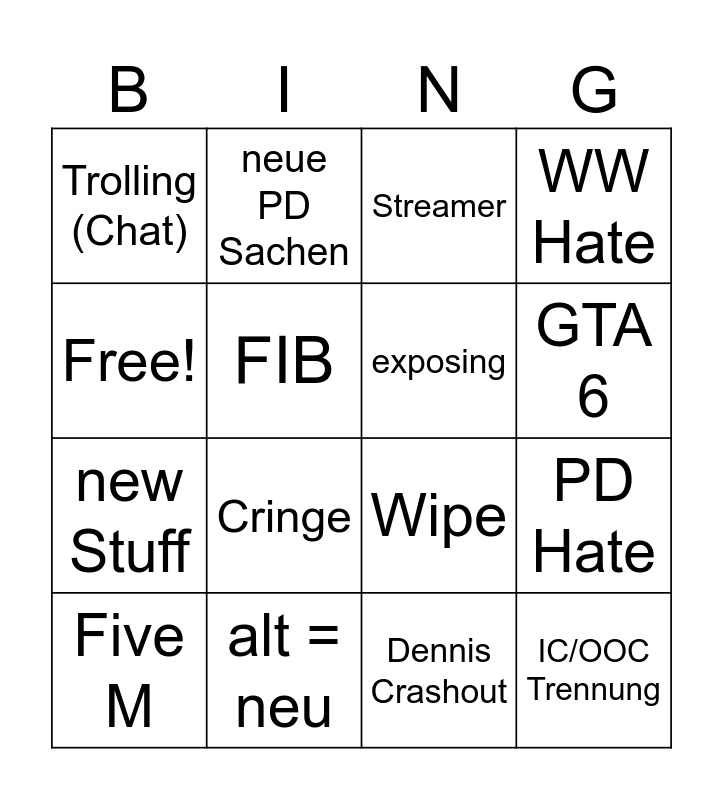 This bingo card has 17 words: Five M, alt = neu, Streamer, WW Hate, new Stuff, FIB, Wipe, GTA 6, Free!, Cringe, Dennis Crashout, PD Hate, Trolling (Chat), neue PD Sachen, exposing, IC/OOC Trennung and Wipe.