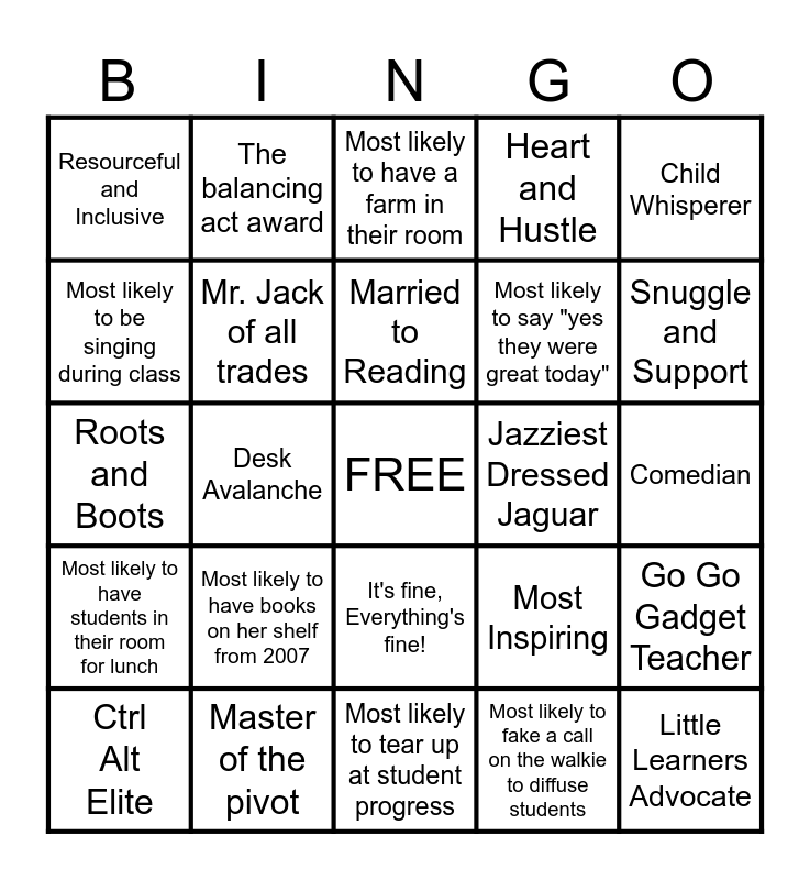 This bingo card has a free space and 30 words: Master of the pivot, Kindergarten Princess, Desk Avalanche, Most Supportive Coworker, Resourceful and Inclusive, Most likely to have a farm in their room, Mr. Jack of all trades, It's fine, Everything's fine!, Jazziest Dressed Jaguar, Most likely to tear up at student progress, Comedian, Little Learners Advocate, Most likely to fake a call on the walkie to diffuse students, Mayor of the neighborhood parent circle, Snuggle and Support, Calmest Vibes, Most Inspiring, Most likely to have students in their room for lunch, Most likely to have books on her shelf from 2007, Child Whisperer, Roots and Boots, Spreadsheet Sorcerer, The balancing act award, Most likely to say "yes they were great today", Most likely to be singing during class, Heart and Hustle, Go Go Gadget Teacher, Ctrl Alt Elite, Married to Reading and The voice of Chimborazo.