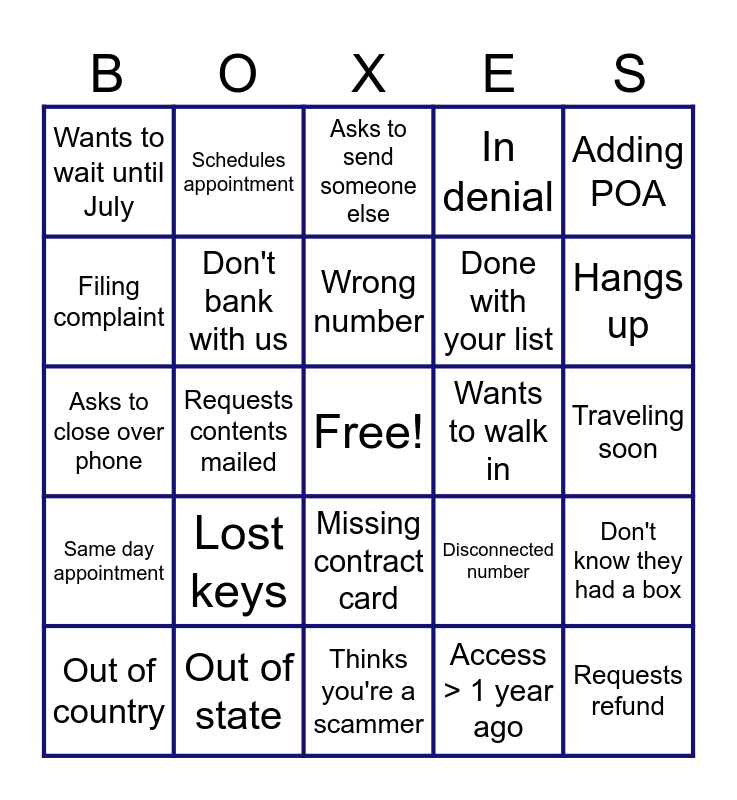 This bingo card has a free space and 27 words: Disconnected number, Transferring to another language, Done with your list, Thinks you're a scammer, Filing complaint, Asks to send someone else, Schedules appointment, Same day appointment, Wants to walk in, Don't know they had a box, Asks to close over phone, In denial, Out of country, Out of state, Hangs up, Tons of questions, Don't bank with us, Wrong number, Lost keys, Wants to wait until July, Traveling soon, Access > 1 year ago, Requests contents mailed, Requests refund, Missing contract card, Adding POA and No phone number.