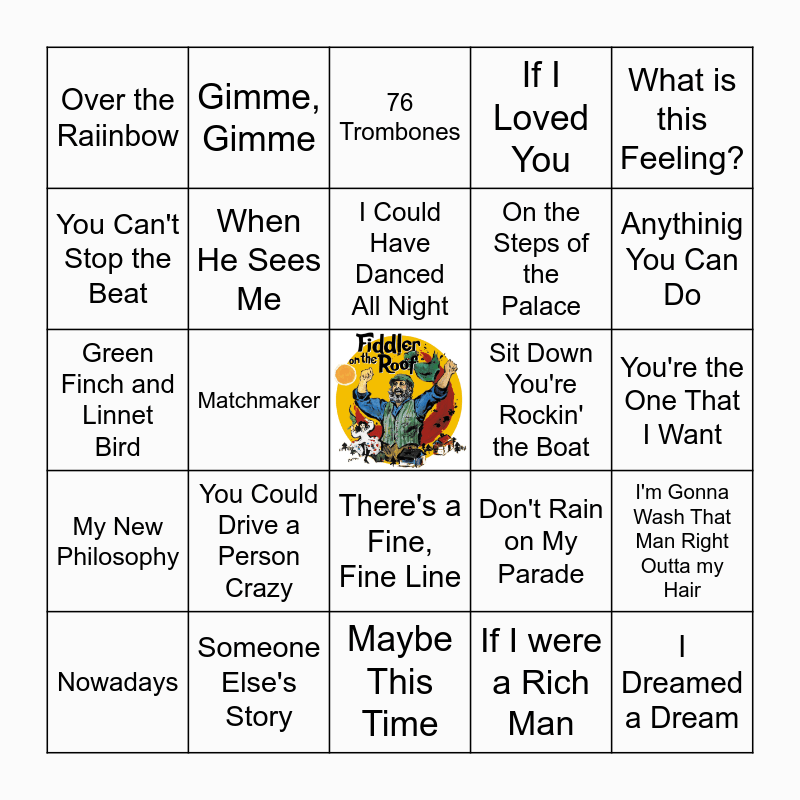 This bingo card has a free space and 48 words: Don't Cry For Me Argentina, I Dreamed a Dream, Master of the House, Maybe This Time, You Could Drive a Person Crazy, The Ladies Who Lunch, Gimme, Gimme, Good Morning, Baltimore, You Can't Stop the Beat, I Cain't Say No, When He Sees Me, If I Loved You, I'm Gonna Wash That Man Right Outta my Hair, Don't Rain on My Parade, Goodnight My Someone, Getting to Know You, I Could Have Danced All Night, Sit Down You're Rockin' the Boat, Ease on Down the Road, What is this Feeling?, Matchmaker, If I were a Rich Man, Over the Raiinbow, On the Steps of the Palace, Dancing Through Life, Anythinig You Can Do, Nowadays, Cell Block Tango, There's a Fine, Fine Line, My New Philosophy, One, The Lonely Goatherd, Shy, Ribbons Down my Back, Someone Else's Story, You'll be Back, Seasons of Love, You're the One That I Want, Money, Money, Money, Jet Song, Make 'Em Laugh, Benjamin Calypso, 76 Trombones, Being Alive, Green Finch and Linnet Bird, It's the Hard-Knock Life, Vanilla Ice Cream and King of New York.