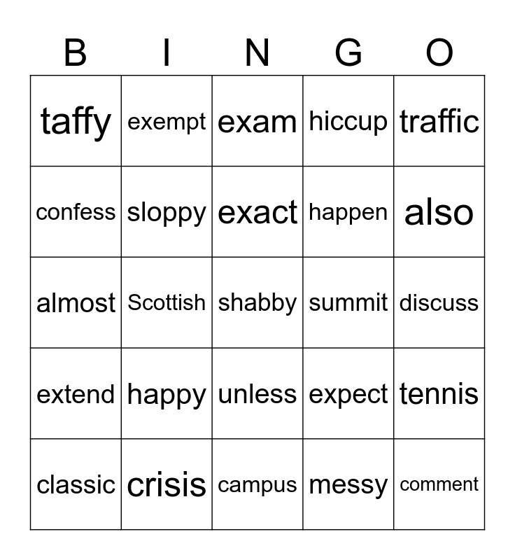 This bingo card has 25 words: happy, campus, exact, classic, traffic, taffy, confess, exempt, summit, unless, happen, almost, expect, tennis, sloppy, comment, discuss, exam, also, Scottish, shabby, crisis, extend, hiccup and messy.