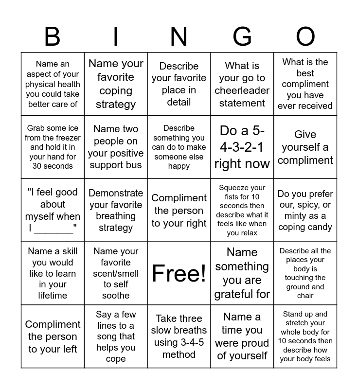 This bingo card has 26 words: Free!, Name a time you were proud of yourself, Describe something you can do to make someone else happy, Say a few lines to a song that helps you cope, What is the best compliment you have ever received, Name an aspect of your physical health you could take better care of, Grab some ice from the freezer and hold it in your hand for 30 seconds, Name your favorite coping strategy, Do you prefer our, spicy, or minty as a coping candy, Name something you are grateful for, Do a 5-4-3-2-1 right now, "I feel good about myself when I _______", Describe all the places your body is touching the ground and chair, Compliment the person to your left, Demonstrate your favorite breathing strategy, Name your favorite movie to help you cope, What is your go to cheerleader statement, Name a skill you would like to learn in your lifetime, Describe your favorite place in detail, Compliment the person to your right, Give yourself a compliment, Take three slow breaths using 3-4-5 method, Squeeze your fists for 10 seconds then describe what it feels like when you relax, Name your favorite scent/smell to self soothe, Name two people on your positive support bus and Stand up and stretch your whole body for 10 seconds then describe how your body feels.