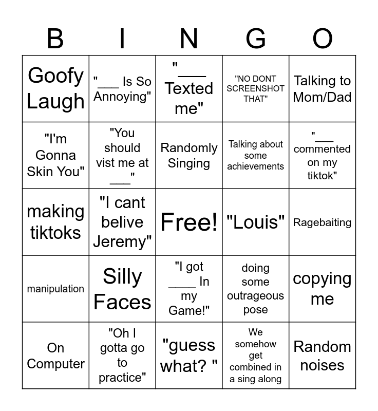This bingo card has a free space and 24 words: Silly Faces, "Oh I gotta go to practice", Randomly Singing, On Computer, Talking to Mom/Dad, Goofy Laugh, "I'm Gonna Skin You", "___ Is So Annoying", "Louis", "I got ____ In my Game!", Talking about some achievements, making tiktoks, doing some outrageous pose, copying me, "You should vist me at ___", We somehow get combined in a sing along, Ragebaiting, "___ Texted me", "___ commented on my tiktok", "I cant belive Jeremy", Random noises, manipulation, "NO DONT SCREENSHOT THAT" and "guess what? ".