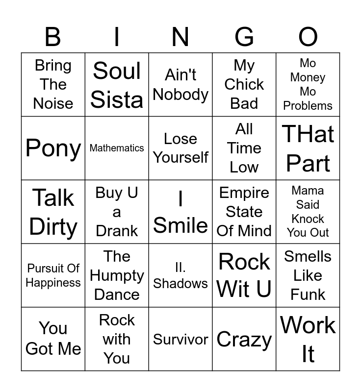This bingo card has a free space and 39 words: The World Is Yours, Whatta Man, No Sleep Till Brooklyn, Mathematics, You Got Me, II. Shadows, Lose Yourself, Express Yourself, Mo Money Mo Problems, Pursuit Of Happiness, Buy U a Drank, My Chick Bad, Work It, Mama Said Knock You Out, Empire State Of Mind, The Humpty Dance, I'll Make Love To You, Bring The Noise, Rapper's Delight, Rock Wit U, Pony, Survivor, All Time Low, THat Part, See You Again, Kill Bill, Location, Tightrope, Ice Box, Soul Sista, Funny Thing, Waterfalls, Ain't Nobody, Rock with You, Crazy, The Man, Smells Like Funk, Talk Dirty and Didn't Cha Know.