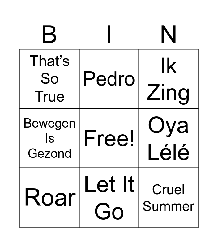 This bingo card has a free space and 19 words: Echte Liefde Is Te Koop, Atlas, Ik Zing, Jouw Idee, Ordinary, Cruel Summer, Lotje, That’s So True, Pedro, As It Was, Flowers, Oya Lélé, Roar, Entourage, Ken Je Dat Gevoel, Ga Dan, Bewegen Is Gezond, Let It Go and Automatisch.