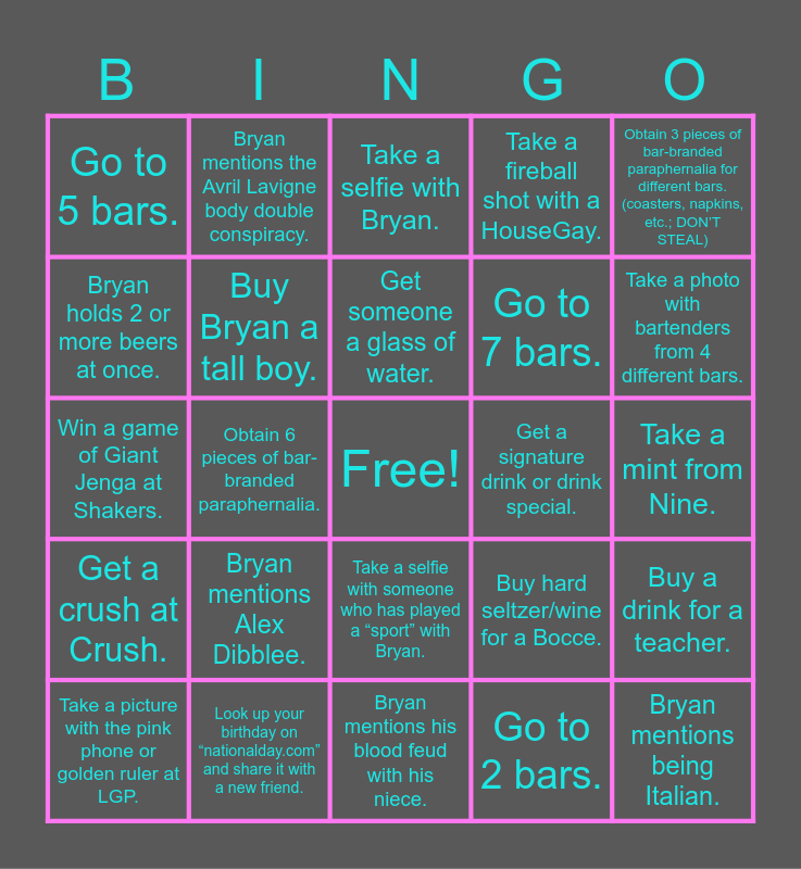 This bingo card has a free space and 50 words: Get the dj to play Sk8er boi., Bryan mentions being Italian., Bryan mentions his brothers., Bryan mentions his blood feud with his niece., Bryan mentions Alex Dibblee., Bryan mentions being from Baltimore., Bryan mentions the Avril Lavigne body double conspiracy., Bryan mentions his leg injury., Bryan holds 2 or more beers at once., Catch Bryan fixing his hair in a reflective surface., Buy Bryan a tall boy., Take a fireball shot with a HouseGay., Buy a drink for a teacher., Buy hard seltzer/wine for a Bocce., Take a shot with a kick baller., Buy a second drink for a teacher., Get someone a glass of water., Get a signature drink or drink special., Take a tequila shot with someone who went to St. Mary’s College of Maryland., Obtain 3 pieces of bar-branded paraphernalia for different bars. (coasters, napkins, etc.; DON’T STEAL), Obtain 6 pieces of bar-branded paraphernalia., Go to 2 bars., Go to 5 bars., Go to 7 bars., Go to 9 bars., Take a photo with bartenders from 2 different bars., Take a photo with bartenders from 4 different bars., Take a picture in front of 5 different bars., Take a selfie with Bryan., Take a selfie with someone who has played a “sport” with Bryan., Take a selfie with someone who has worked with Bryan., Take a selfie with someone who attended school with Bryan., Take a selfie with a new friend., Take a selfie with two new friends., Look up your birthday on “nationalday.com” and share it with a new friend., Look up your birthday + “Florida man” and share it with a new friend., Learn a new person's name, pronouns, & zodiac sign., Ask someone what their House or spirit/favorite animal is., Buy a mule at JRs., Take a mint from Nine., Drink out of the iconic 9 wine glass., Buy VCR cleaner at Trade., Write your phone number on a brick at Trade., Call a phone number on a brick at Trade., Take a picture with the pink phone or golden ruler at LGP., Win a game of Giant Jenga at Shakers., Write a phone number on a Jenga brick at Shakers., Buy a bucket at Kiki., Get a crush at Crush. and Take a picture with the David statue at Bunker..