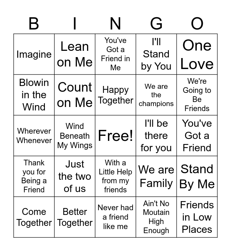 This bingo card has a free space and 24 words: Just the two of us, Better Together, Happy Together, Come Together, One Love, Imagine, Blowin in the Wind, Lean on Me, I'll be there for you, With a Little Help from my friends, We are the champions, Wherever Whenever, We are Family, Stand By Me, Count on Me, Ain't No Moutain High Enough, You've Got a Friend, You've Got a Friend in Me, We're Going to Be Friends, Wind Beneath My Wings, Friends in Low Places, Thank you for Being a Friend, I'll Stand by You and Never had a friend like me.