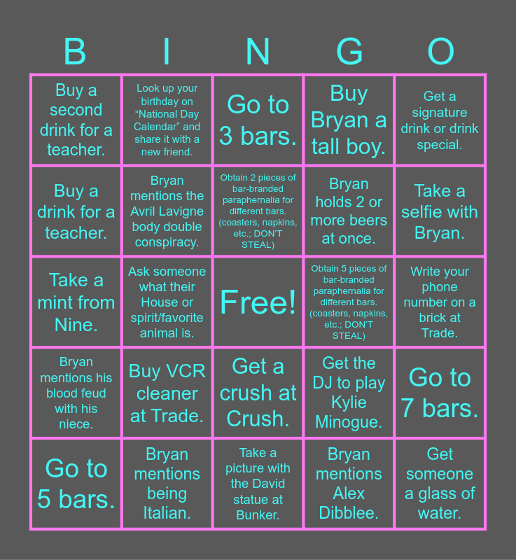 This bingo card has a free space and 59 words: Get the DJ to play Sk8er Boi., Bryan mentions being Italian., Bryan mentions his brothers., Bryan mentions his blood feud with his niece., Bryan mentions Alex Dibblee., Bryan mentions being from Baltimore., Bryan mentions the Avril Lavigne body double conspiracy., Bryan mentions his leg injury., Bryan holds 2 or more beers at once., Catch Bryan fixing his hair in a reflective surface., Buy Bryan a tall boy., Take a fireball shot with a HouseGay., Buy a drink for a teacher., Buy hard seltzer/wine for a Bocce., Take a shot with a kick baller., Buy a second drink for a teacher., Get someone a glass of water., Get a signature drink or drink special., Take a tequila shot with someone who went to St. Mary’s College of Maryland., Obtain 2 pieces of bar-branded paraphernalia for different bars. (coasters, napkins, etc.; DON’T STEAL), Obtain 5 pieces of bar-branded paraphernalia for different bars. (coasters, napkins, etc.; DON’T STEAL), Go to 3 bars., Go to 5 bars., Go to 7 bars., Go to 9 bars., Take a photo with bartenders from 2 different bars., Take a photo with bartenders from 4 different bars., Take a picture in front of 5 different bars., Take a selfie with Bryan., Take a selfie with someone who has played a “sport” with Bryan., Take a selfie with someone who has worked with Bryan., Take a selfie with someone who attended school with Bryan., Take a selfie with a new friend., Take a selfie with two new friends., Look up your birthday on “National Day Calendar” and share it with a new friend., Look up your birthday + “Florida man” and share it with a new friend., Learn a new person's name, pronouns, & zodiac sign., Ask someone what their House or spirit/favorite animal is., Buy a mule at JRs., Take a mint from Nine., Drink out of the iconic 9 wine glass., Buy VCR cleaner at Trade., Write your phone number on a brick at Trade., Call a phone number on a brick at Trade., Take a picture with the pink phone or golden ruler at LGP., Win a game of Giant Jenga at Shakers., Write a phone number on a Jenga brick at Shakers., Buy a bucket at Kiki., Get a crush at Crush., Take a picture with the David statue at Bunker., Take a picture in front of the mural at Uproar., Get the DJ to play Motion City Soundtrack., Get the DJ to play All Time Low., Get the DJ to play New Found Glory., Take a picture in front of 5 different bars., Get the DJ to play Kylie Minogue., Get the DJ to play Tegan & Sara., Take a picture in front of all 9 bars. and Obtain 8 pieces of bar-branded paraphernalia for different bars. (coasters, napkins, etc.; DON’T STEAL).