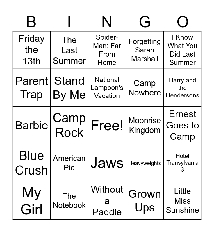 This bingo card has a free space and 39 words: 500 Days of Summer, Dirty Dancing, Adventureland, Stand By Me, My Girl, Jaws, National Lampoon's Vacation, Independence Day, I Know What You Did Last Summer, Blue Crush, Camp Rock, Forgetting Sarah Marshall, Little Miss Sunshine, Ernest Goes to Camp, Moonrise Kingdom, American Pie, The Great Outdoors, Friday the 13th, Meatballs, Heavyweights, Parent Trap, Without a Paddle, Camp Nowhere, Harry and the Hendersons, Sisterhood of the Traveling Pants, High School Musical 2, Space Camp, Journey to the Center of the Earth, The Goonies, The Last Summer, Troop Beverly Hills, Luca, Spider-Man: Far From Home, The Notebook, Grown Ups, Crazy Rich Asians, Hotel Transylvania 3, Barbie and In the Heights.